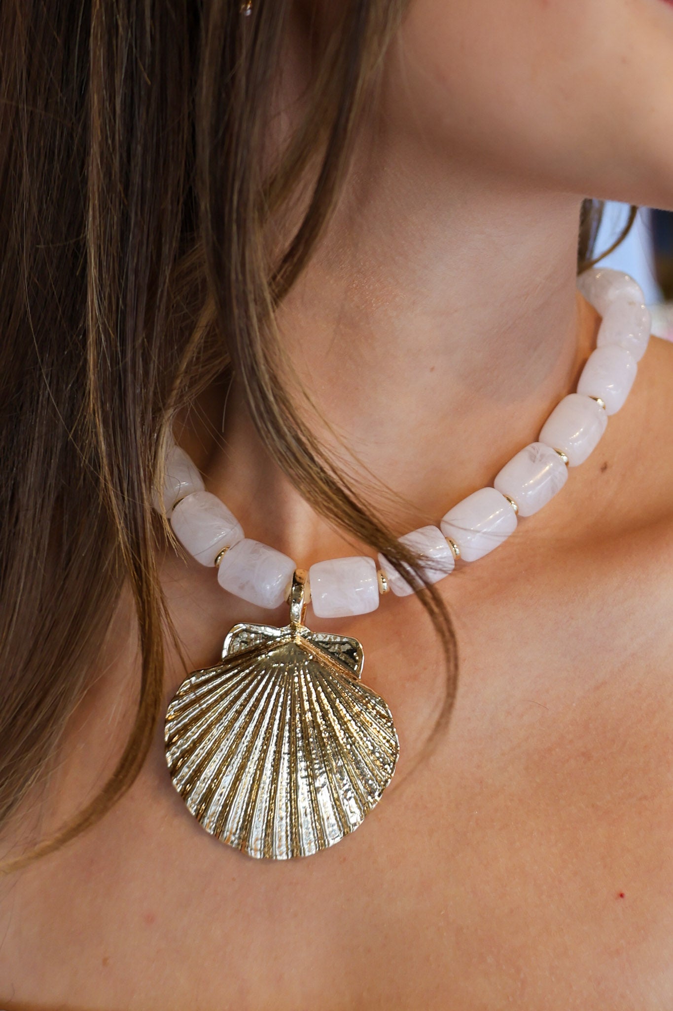 Make a statement with this oversized gold finish shell pendant suspended from a chunky beaded necklace. An effortless way to elevate any outfit with bohemian-inspired elegance.
