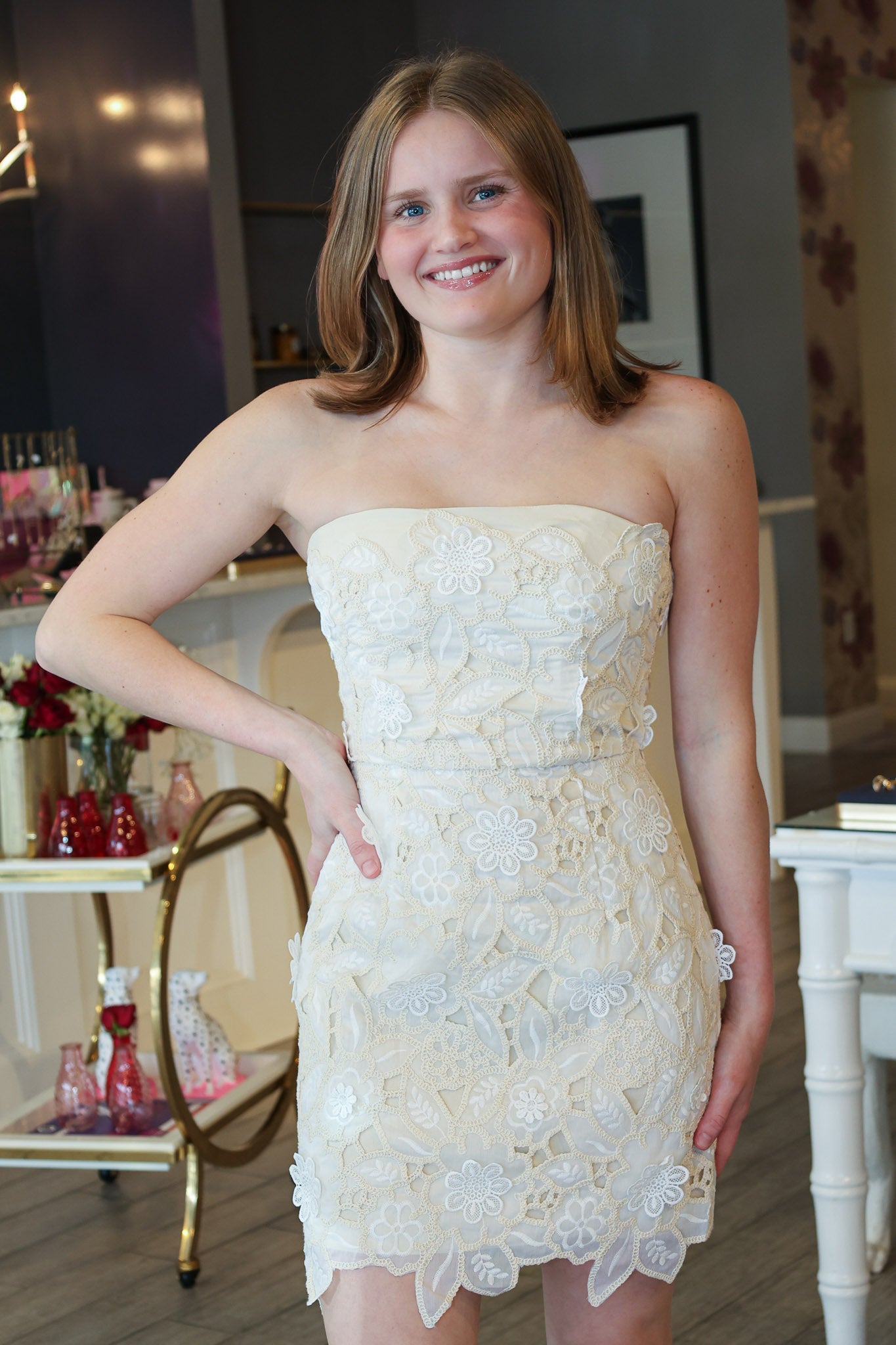 Effortlessly romantic and undeniably chic, the Sienna Strapless Mini Dress in Cream features a scalloped neckline and embroidered organza lace for an elevated look that transitions seamlessly from engagement celebrations to spring soirées. Its fitted silhouette and luxe fabrication strike the perfect balance between modern sophistication and vintage-inspired elegance.