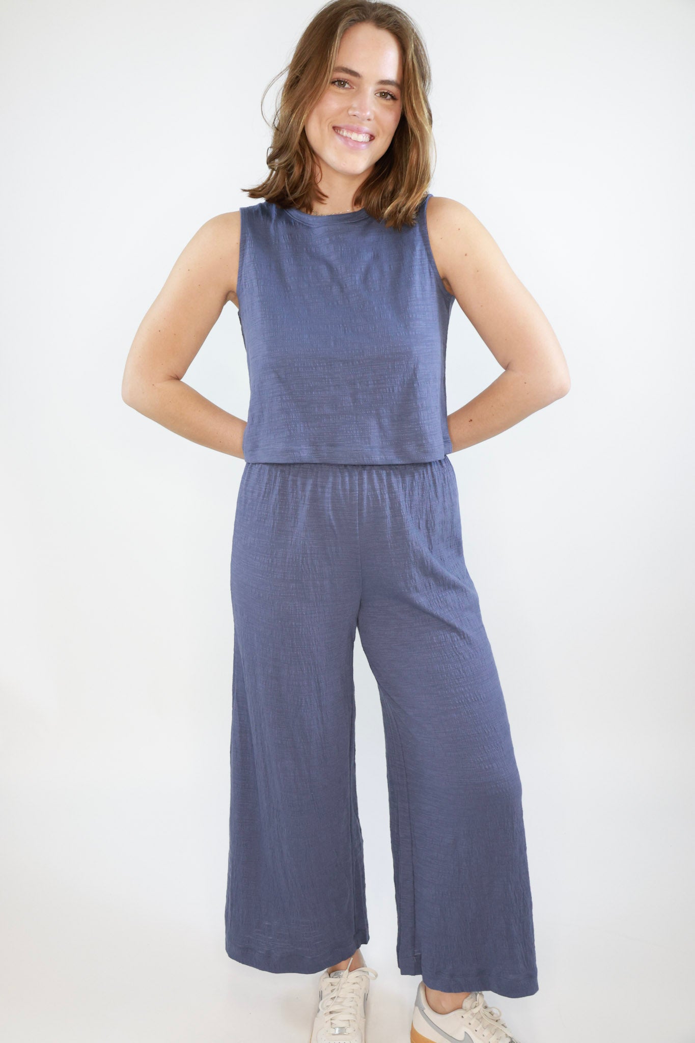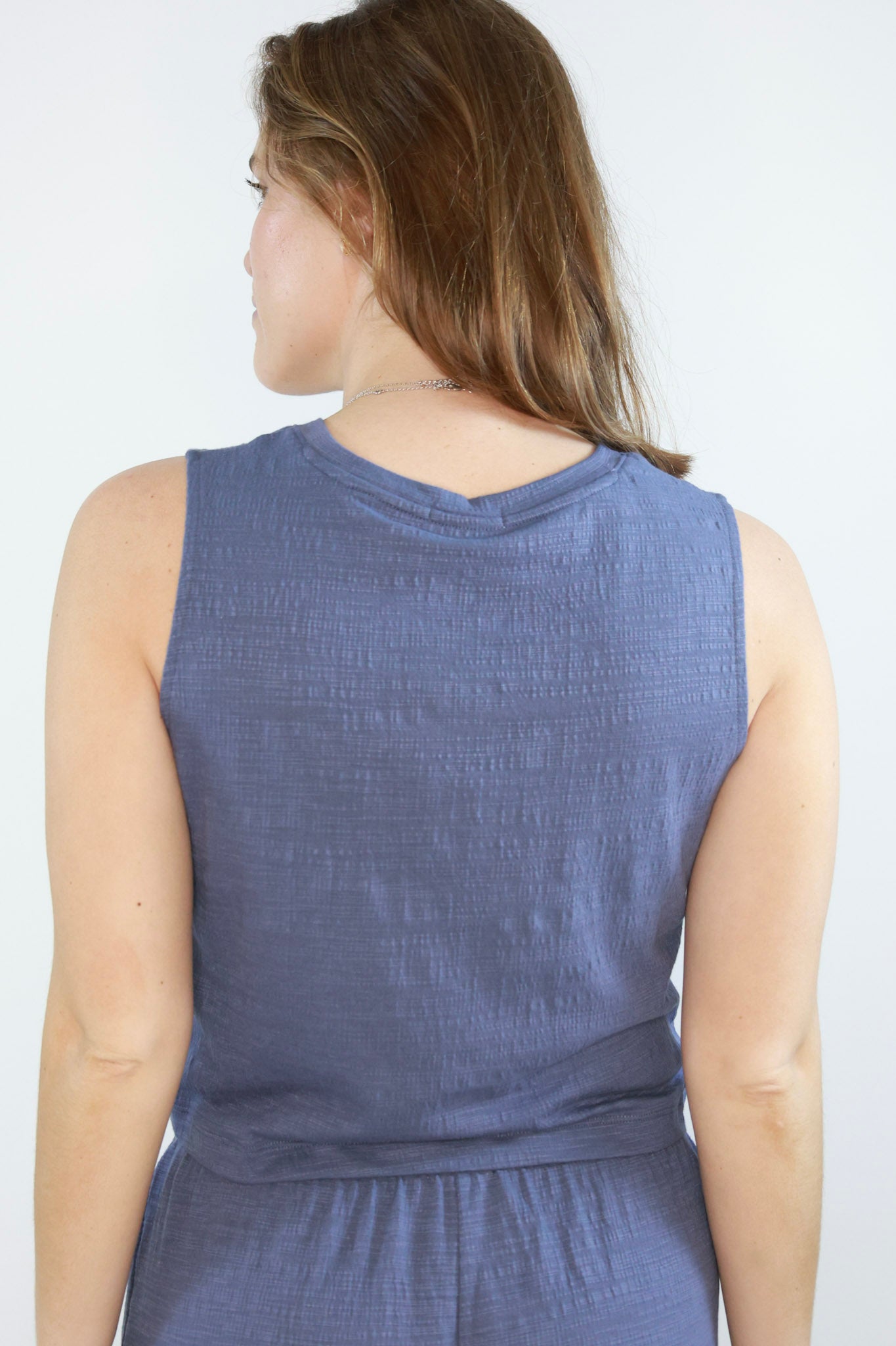 Upgrade your wardrobe with our Sloane Textured Top. This sleeveless top boasts a loose fit that pairs perfectly with our Scout Textured Pant. Elevate your style with this versatile and comfortable duo.