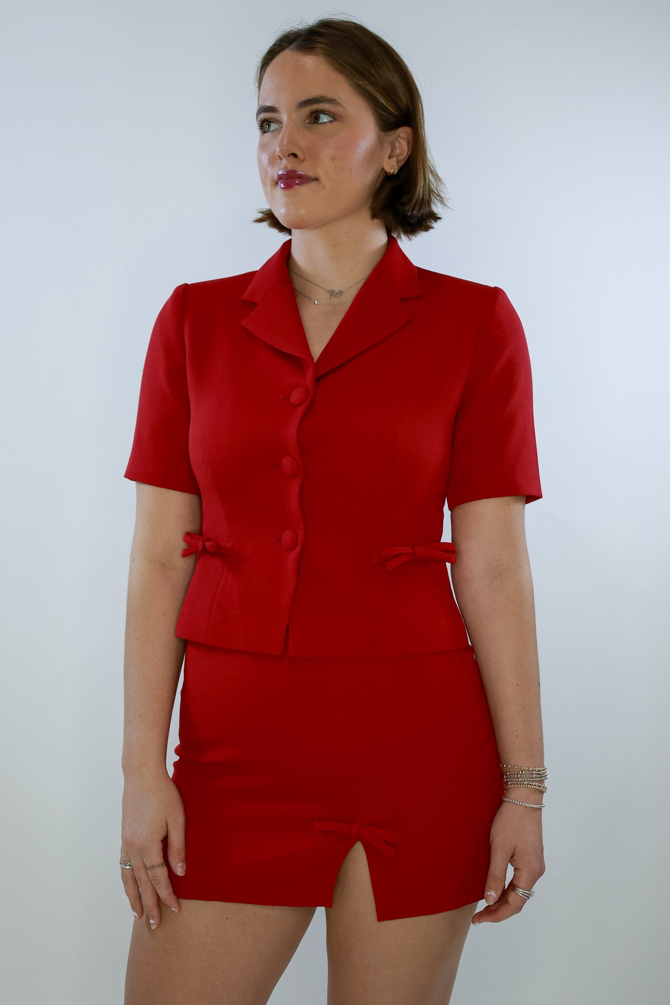 Introducing the Sophie Skirt, a luxurious statement piece for the modern woman. Adorned with a delicate mini bow accent, this skirt exudes sophistication and pairs perfectly with the Sophie Blazer Top. Elevate your wardrobe with this elegant and versatile addition.