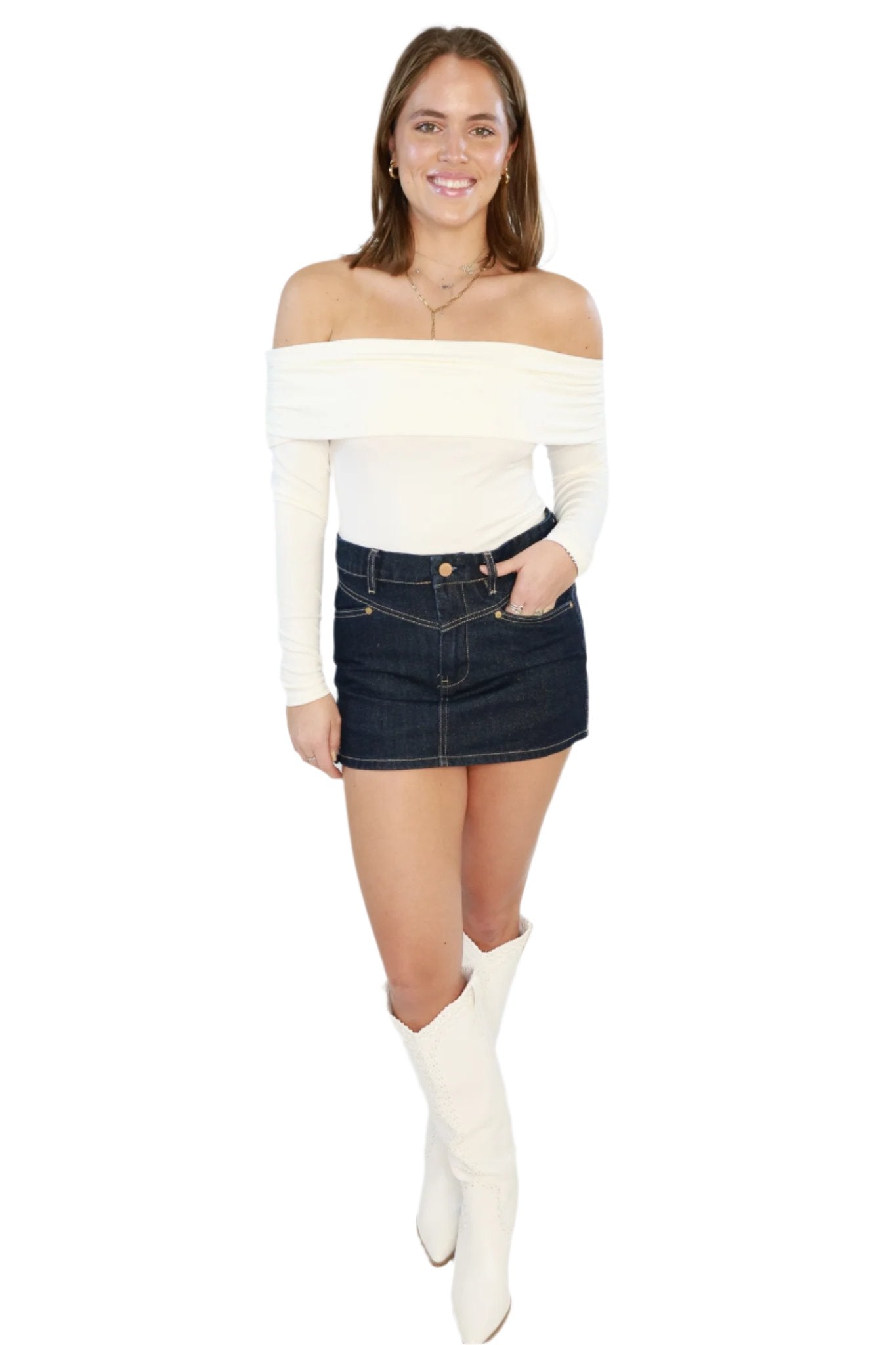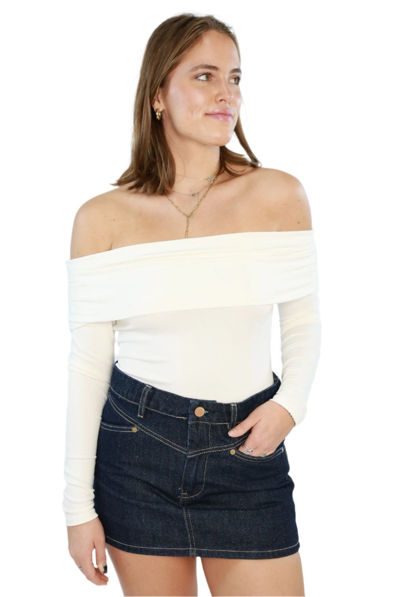 As an industry expert, I present Still The One Bodysuit - a versatile and stylish addition to any wardrobe. Made from ribbed fabric, this off the shoulder bodysuit offers a flattering fit and features long sleeves for added coverage. Perfect for any occasion, elevate your look with this must-have piece.