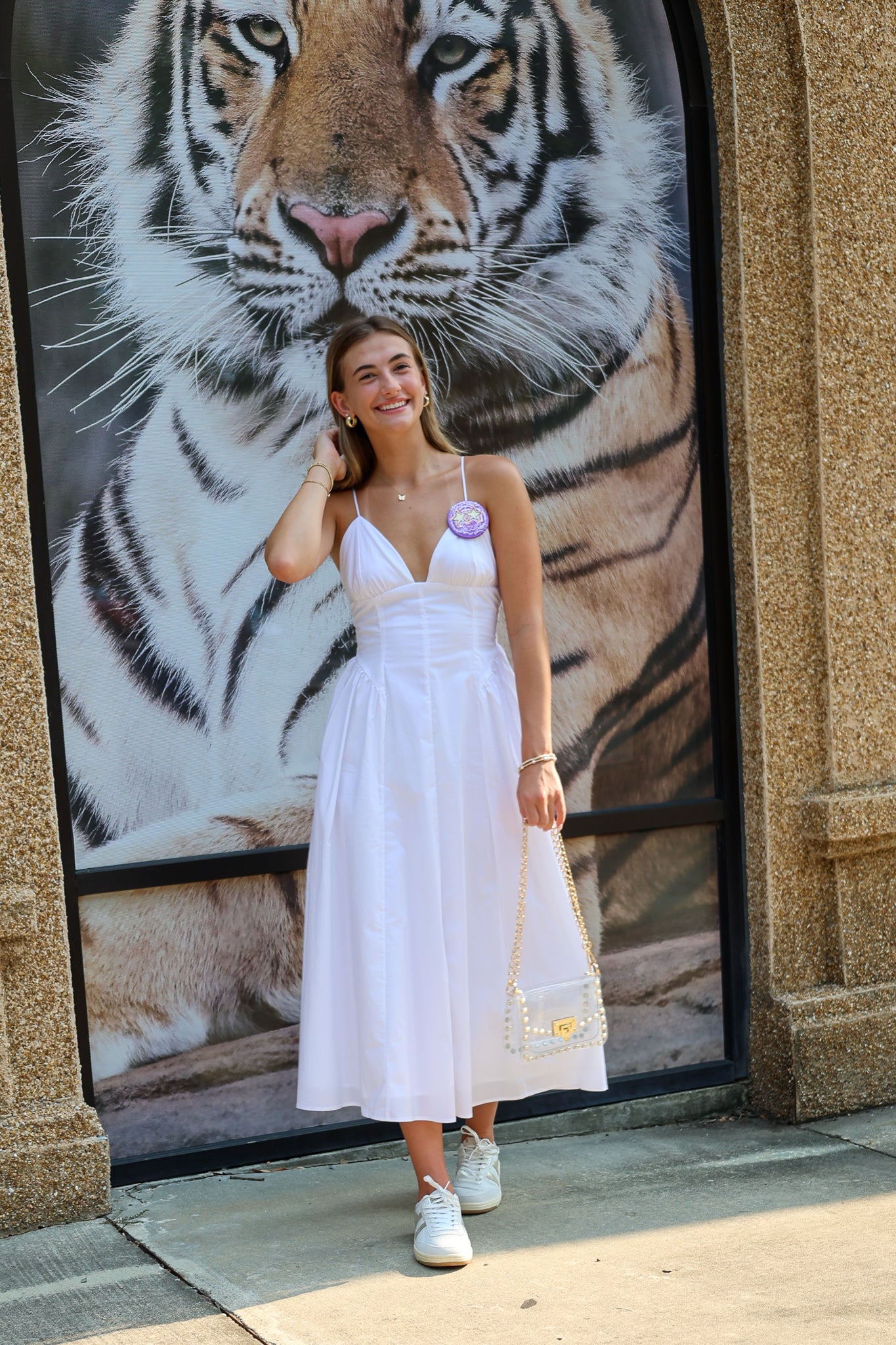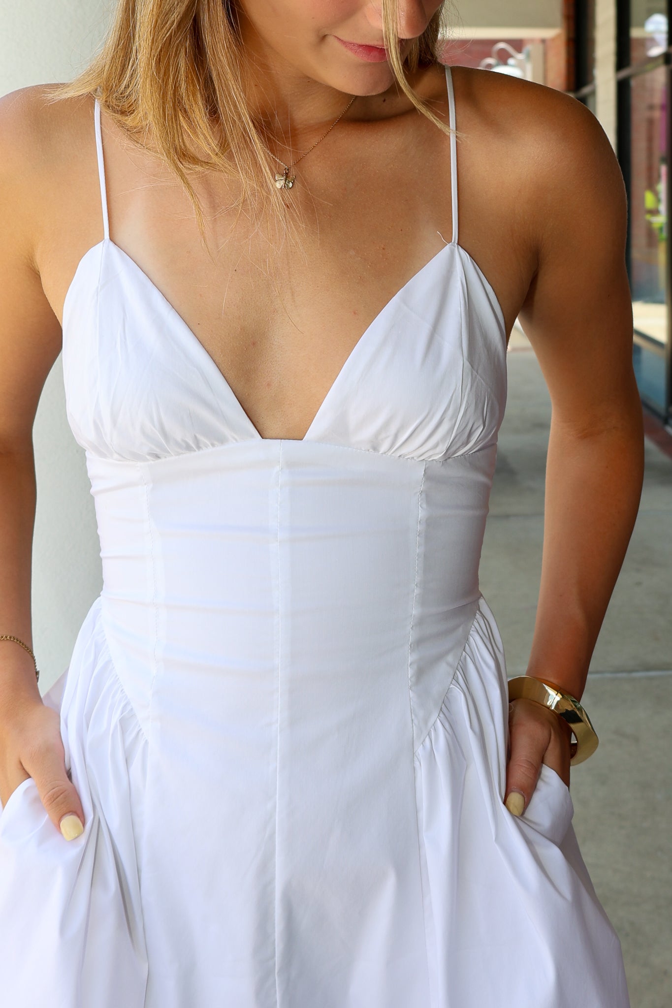 The Sydney Dress is a total show stopper with its white midi length, deep V-neckline, and delicate spaghetti straps. It features a tailored bodice and a full skirt with pockets, making it both stylish and super practical for any fun occasion.
