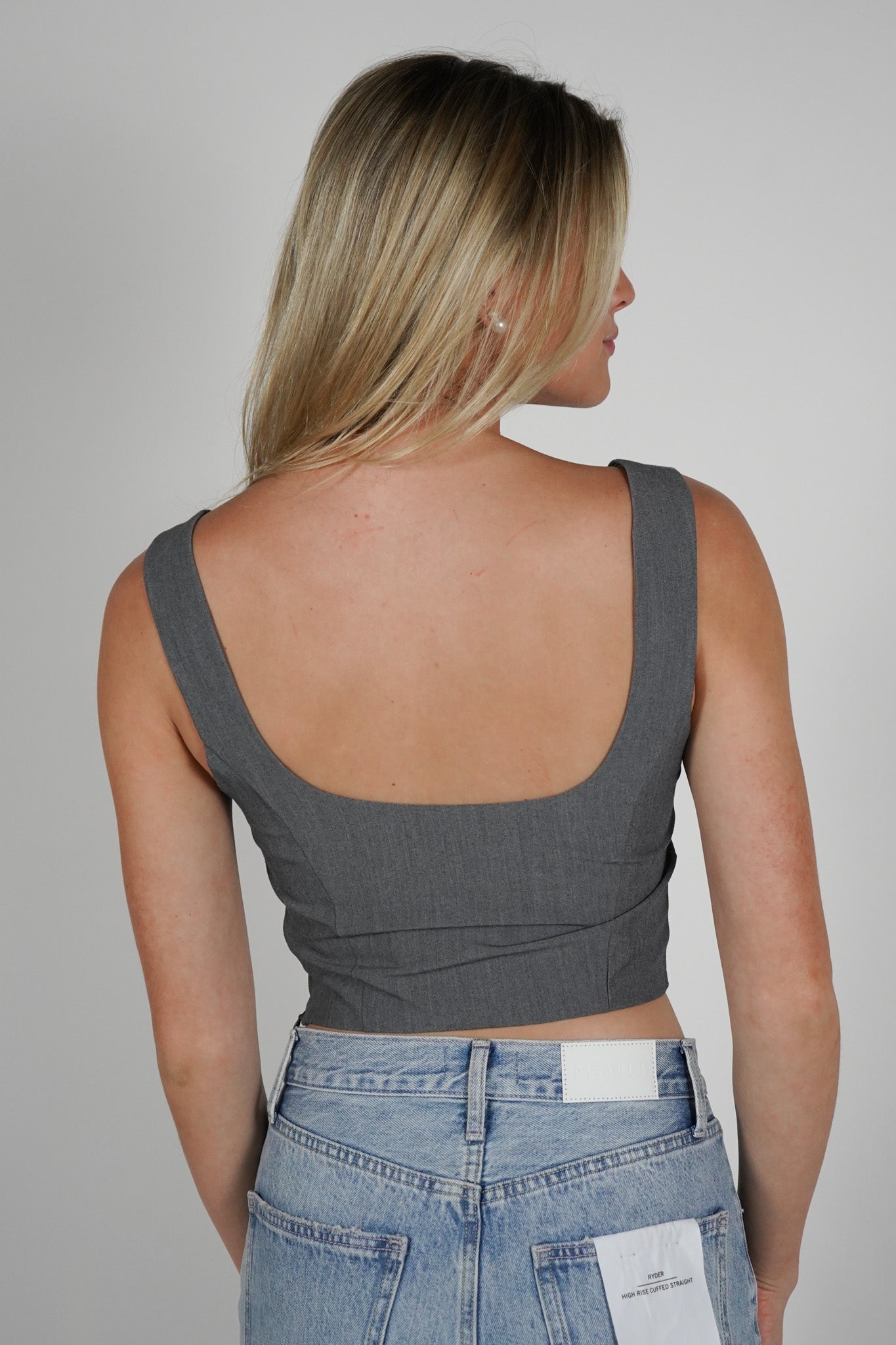 Stay stylish and confident with our Tate Top. This versatile gray crop top features front cutouts adorned with delicate bows, adding a subtle and feminine touch to any outfit. Embrace your unique style and elevate it with this must-have piece.