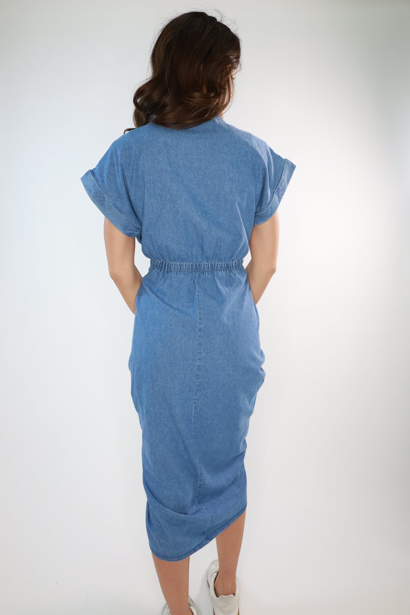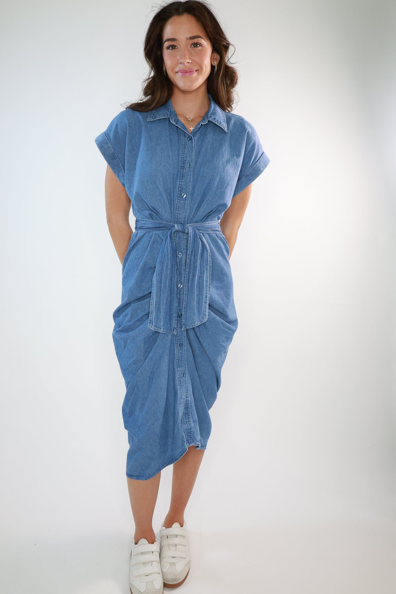 The Tori Dress features a button-up front with ruched details and an attached tie belt, perfect for creating a flattering silhouette. With short sleeves, this dress is ideal for warmer weather and can easily be dressed up or down for any occasion. Stay stylish and comfortable with this versatile dress.