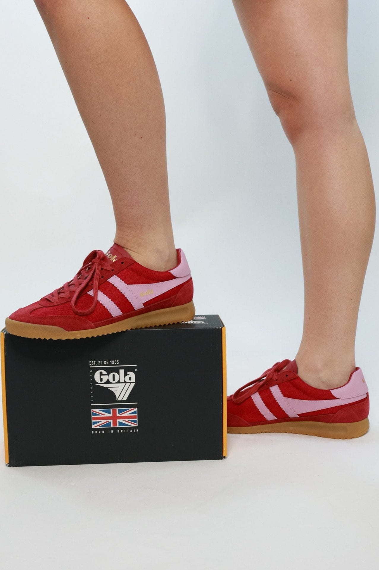 The Tornado Sneaker combines a deep red heavy weave nylon upper with suede trims and a candy-colored wingflash side trim. Featuring a slight wedge gum sole, it delivers classic old-school sneaker style with a modern twist.