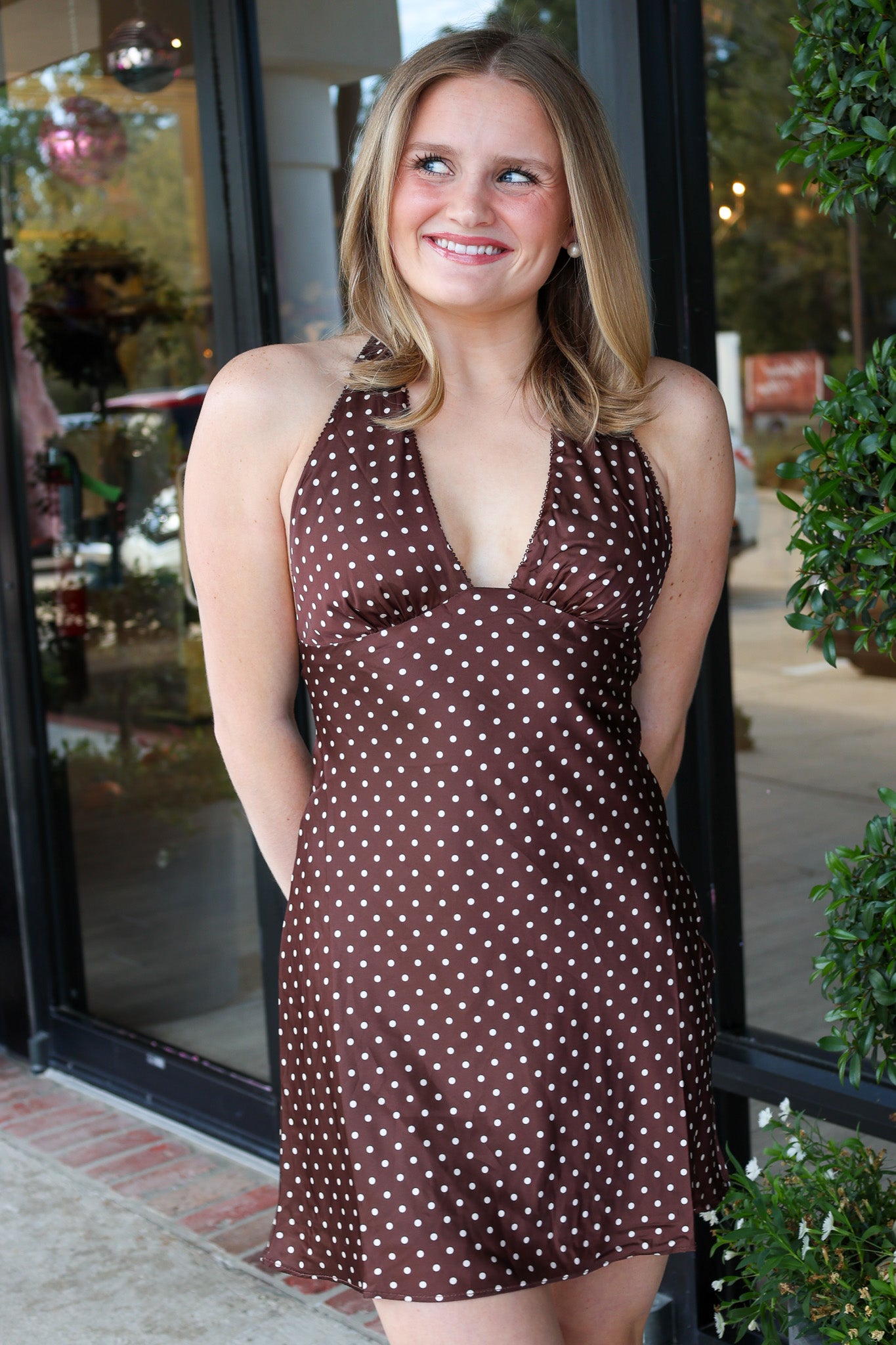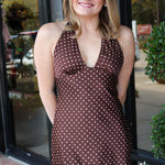 The Vivian Dress is a cute brown mini with fun white polka dots that totally stand out. Its halter neck style gives it a fresh, summery vibe, while the plunging neckline adds a little boldness. Perfect for casual hangouts or parties, this dress is all about rocking a playful and confident look.