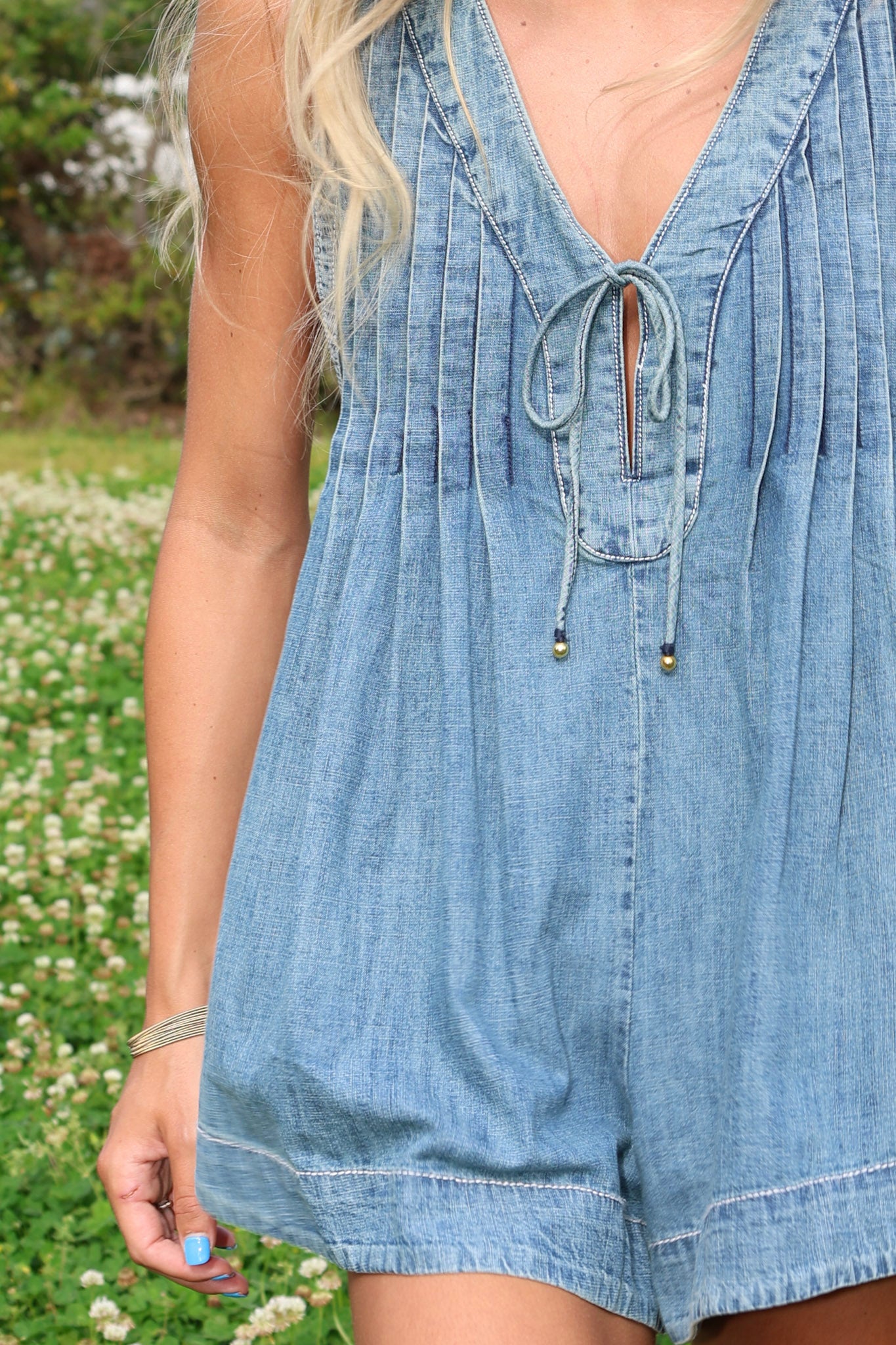 Unleash your inner fashionista with the Webster Romper. With its front tie, pleated details and soft denim fabric, this sleeveless romper is the perfect blend of style and comfort. Stand out from the crowd and add this playful piece to your wardrobe!