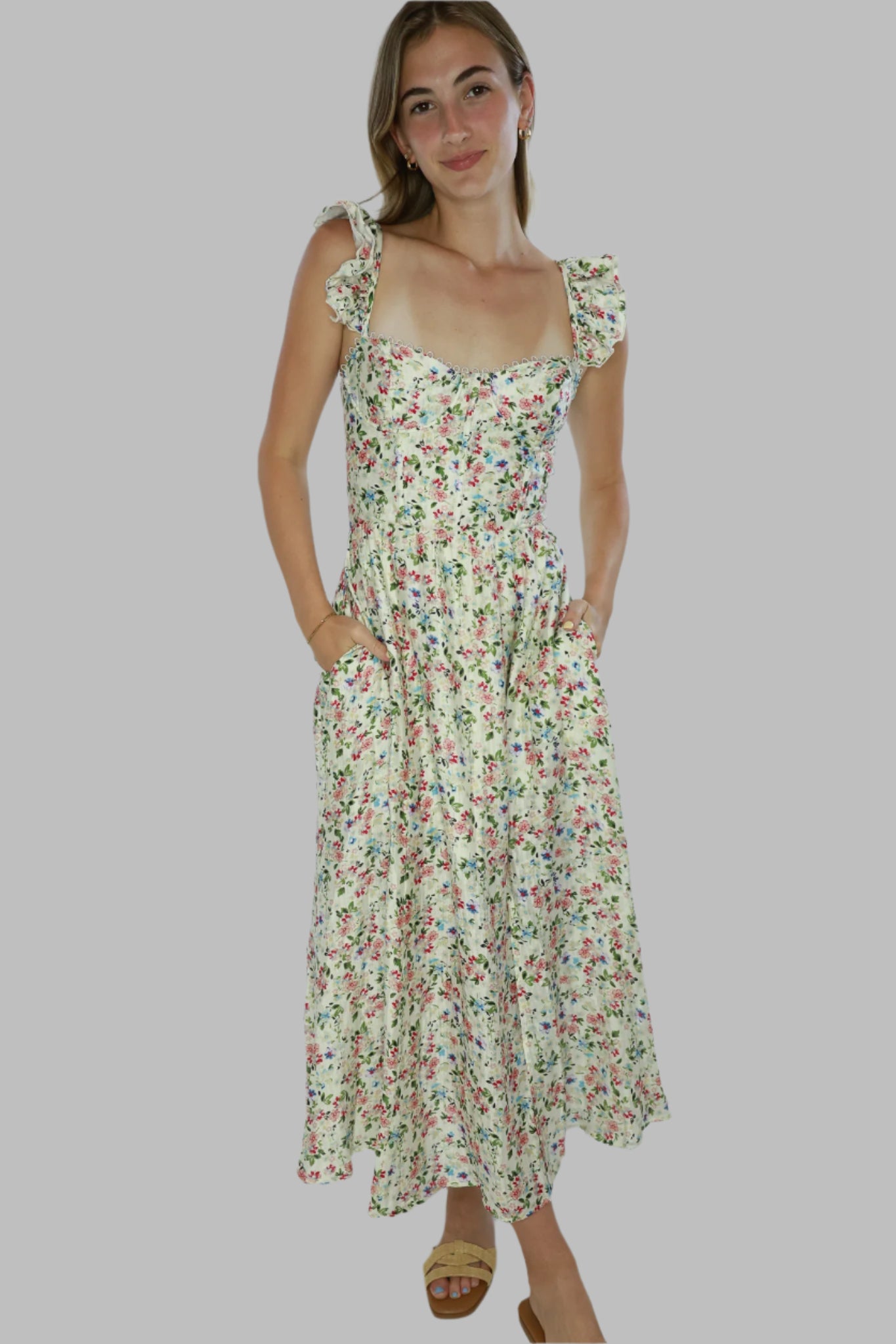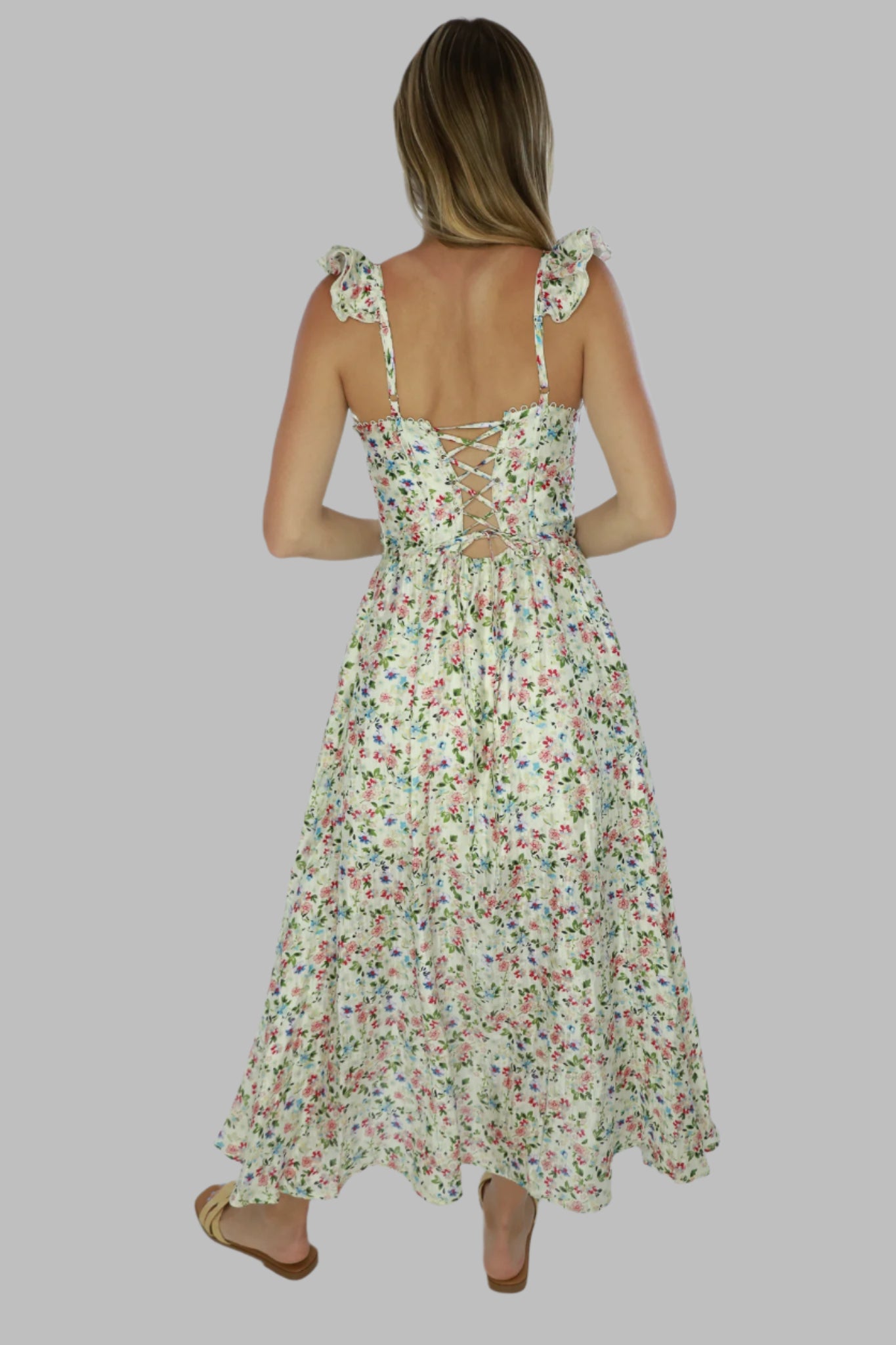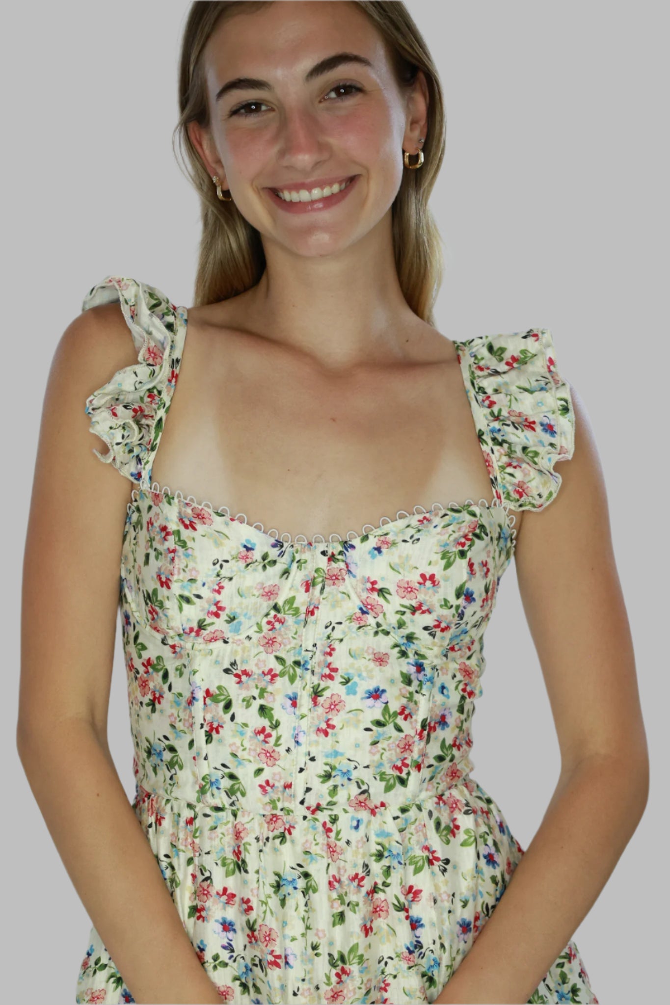 Get ready to turn heads in the quirky and playful Wedelia Dress! The corset top adds a touch of daring to the floral midi design, creating a unique and stylish look. Perfect for any occasion, this dress is sure to make a statement.